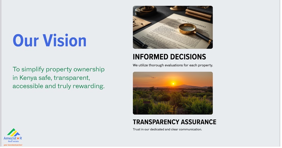 To be the leading real estate company in Kenya, specializing in land and property, recognized for our innovative approach, unparalleled customer experience, and positive impact on the communities we serve.